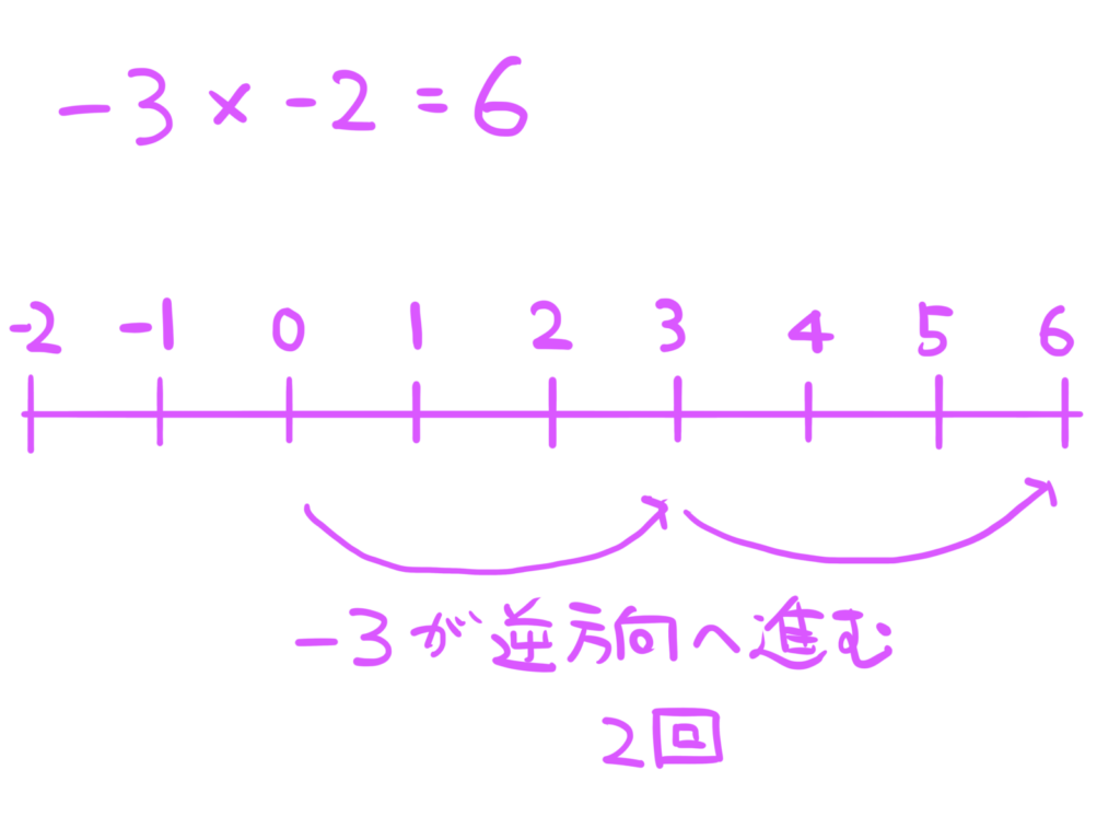 ここで本題に戻り、負の数と負の数を掛ける場合を考えます。たとえば、-3 × -2 はどうなるでしょうか?この場合、負の数を掛けるということは、逆の方向に進むことを意味します。すなわち、-3 × -2 は左に3単位進む動きを2回逆方向(右方向)に繰り返すことを意味し、結果として右に6単位進んだ位置、すなわち+6に到達します。