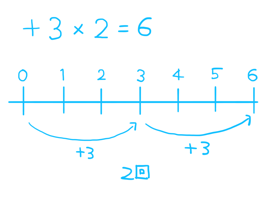 正の数同士の掛け算は、数直線上で簡単に理解できます。たとえば、+3 × +2 は数直線上で右に3単位進む動きを2回繰り返すことを意味し、結果として右に6単位進んだ位置、すなわち+6に到達します。